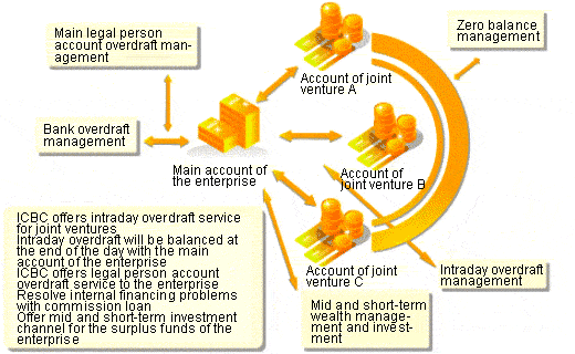 5. Liquidity Management Solution ICBC assists enterprises to establish a liquidity management within the system of the company. Based on the zero balance management on the 7 subordinate joint ventures, in order to ensure the liquidity demand of the enterprise and subordinate joint ventures in the process of production and operation, ICBC offers products and services such as commission loan, intraday overdraft and legal person account overdraft in order to ensure the whole normal settlement of the enterprise and enhance the efficiency of the fund use meanwhile.